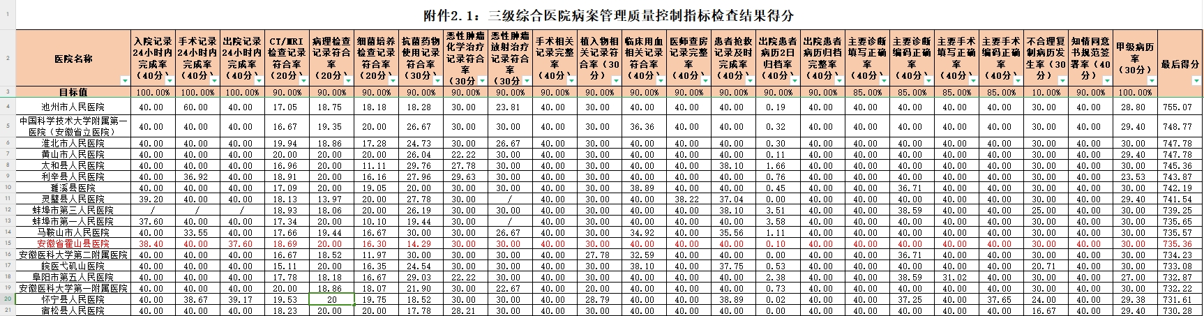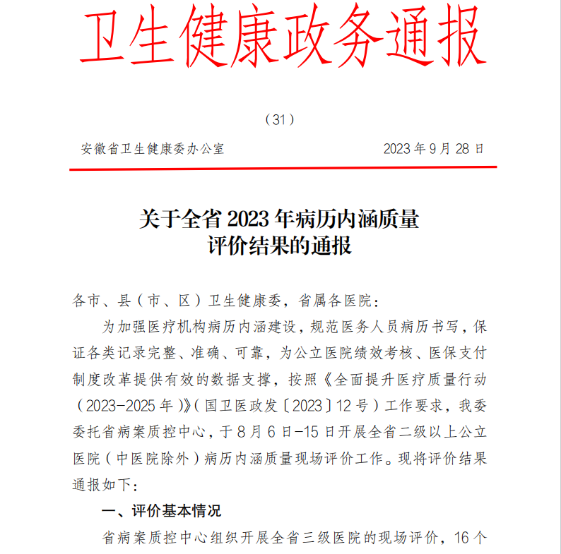 为加强医疗机构病历内涵建设,规范医务人员病历书写,保证各类记录完整、准确、可靠,为公立医院绩效考核、医保支付制度改革提供有效的数据支撑,安徽省病案质控中心在全省二级及以上公立医院(中医院除外)中开展了病历内涵质量现场评价工作。我院在此次评价活动中获得全省三级医院排名第12位,六安市三级医院排名第1位的好成绩。