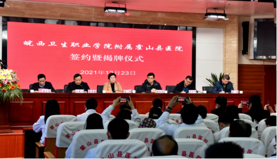 12月23日,“皖西卫生职业学院附属霍山县医院”签约暨揭牌仪式在县医院隆重举行。皖西卫生职业学院院长夏跃武、县政府党组成员汪琴出席活动并致辞。县卫健委主任葛子俊主持仪式。皖西卫生职业学院党委委员、办公室主任汪少炜,教务处处长黄梅,临床医学系党总支书记王侠,学生处处长张磊、副处长陈利帮,县医院院长潘家东和院班子成员、各职能部门负责人参加揭牌仪式。