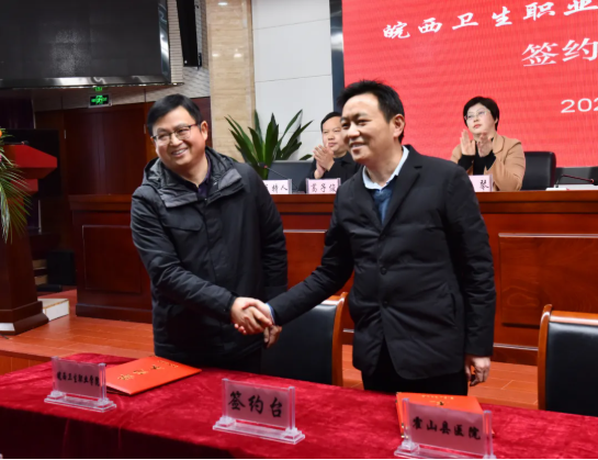 霍山县医院始终坚持以人民为中心,以“制度建院、质量立院、行风塑院、人才兴院、科技强院”为宗旨,实施“人才树”战略,加强“四名(名医、名术、名科、名院)建设,推动医院跨越发展。县医院院长潘家东在精彩致辞中指出,目前,正值霍山县医院全体干部职工同心同德、全力以赴向三级医院进军之际,皖西卫生职业学院附属霍山县医院的签约揭牌将为校院合作揭开崭新的一页,是医院发展史上的又一新的里程碑。通过院校合作,将促进优势互补、共同发展,努力实现学生、学校、医院、社会多方共赢,为广大老百姓提供更加优质的医疗服务。