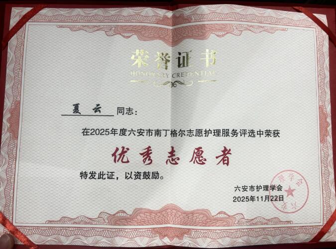 近日,2025年度六安市南丁格尔志愿护理服务评选结果揭晓,我院内一科护士长夏云荣获“优秀志愿者”荣誉称号,荣誉证书由六安市护理学会颁发,以表彰她在志愿护理服务中的突出表现与无私奉献。