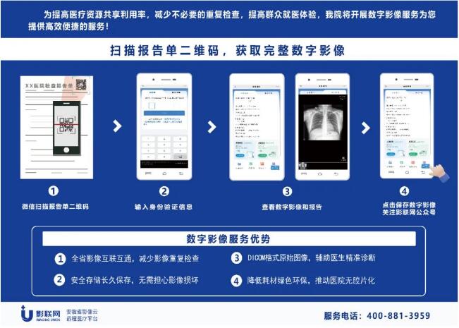 近日,就诊的张女士感叹道“这个报告单上的二维码真方便,扫码就能把影像保存下来,连胶片都不用取,太省事了!”。我院近期上线的数字影像服务,为广大群众带来了多方面的便利。患者在做完CT、磁共振、放射检查后,通过手机扫描报告单上的二维码就可以查看和保存数字影像,还可以通过线上分享,第一时间让家人知晓,在我院就诊还可查看患者授权的外院数字影像服务!