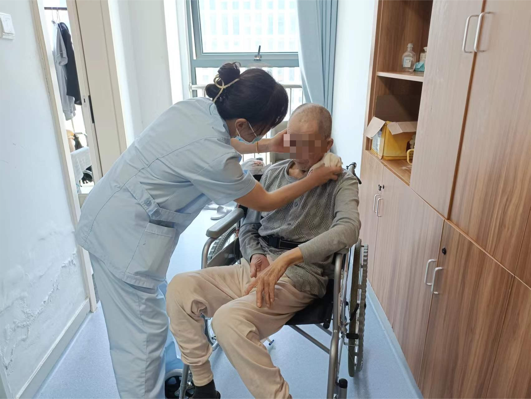据龚爷爷的女儿说,老人入住前一直情绪低落,不愿进食,也不愿和别人交流,还伴有电解质紊乱、低蛋白血症等症状。入住医养中心后,医生每天查房,根据老人情况调整用药,护理人员细心呵护,经常跟龚爷爷聊天,安慰鼓励老人,把老人当做自己的家人,喂饭、喂药、喂水、翻身、洗澡、处理大小便、剪指甲……全天候全方位的悉心照顾,龚爷爷的精神状态也有了明显的改善,现在进食多了,情绪稳定,身体各项检测指标也在逐渐好转。