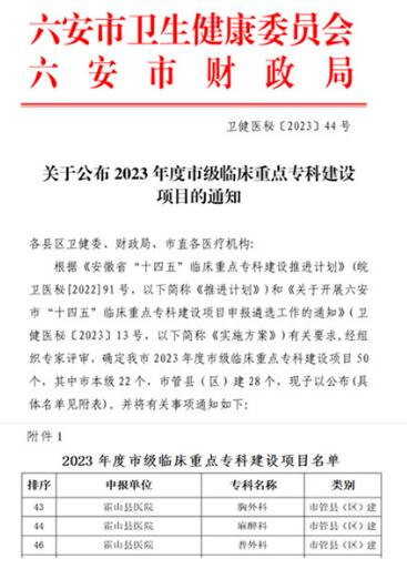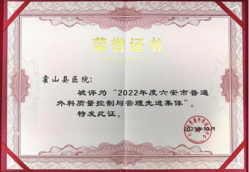 近日,霍山县医院普外科在市普通外科质控中心2022年度五大病种(甲状腺癌、乳腺癌、胃癌、胆石症、下肢静脉曲张)质控检查中,经过笔试、病历评比及手术视频比赛等综合考评,从治疗规范性、合理性等多方面考量打分,最终位居三甲,遴选为六安市普通外科质控中心优秀单位,并在2023年六安市普通外科质控中心年度工作会上被授予“六安市普通外科质量控制与管理先进集体”荣誉称号。