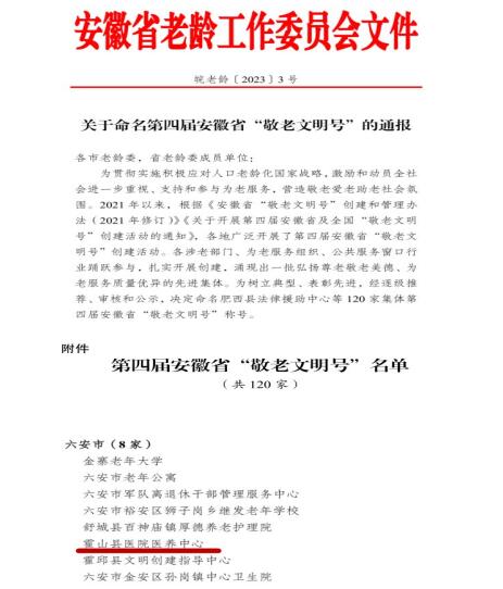近日,霍山县医院医养中心获得了安徽省老龄委颁发的第四届安徽省“敬老文明号”荣誉称号,六安市仅8家单位获此殊荣,我院医养中心是县内唯一一家。