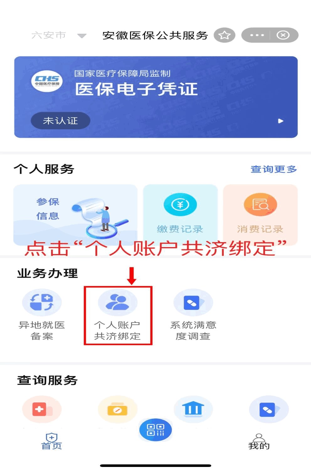 第一步:职工医保参保人在个人支付宝中搜索并打开“安徽医保公共服务”小程序,选择左上角本人职工医保的【参保地】(如六安市),点击“个人账户共济绑定”。