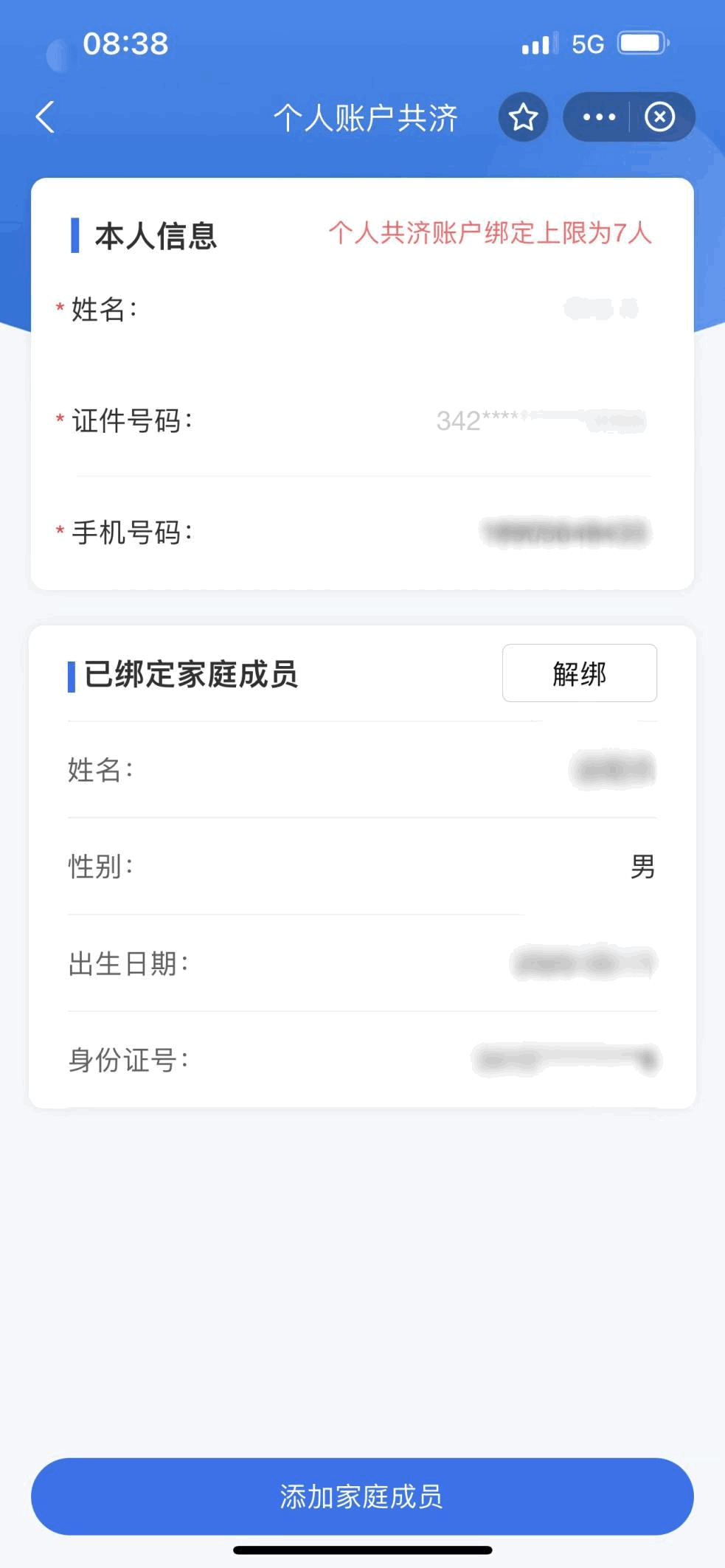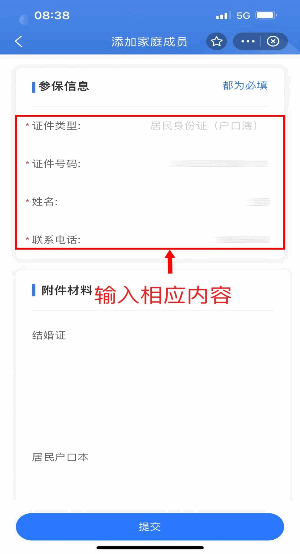 第三步:在界面点击【添加家庭成员】,弹出界面,输入配偶、父母、子女的证件号码、联系电话(系统自动查询该证件号码对应的参保人姓名),上传结婚证或居民户口簿等证明资料,核对无误后,点击【提交】,完成绑定。